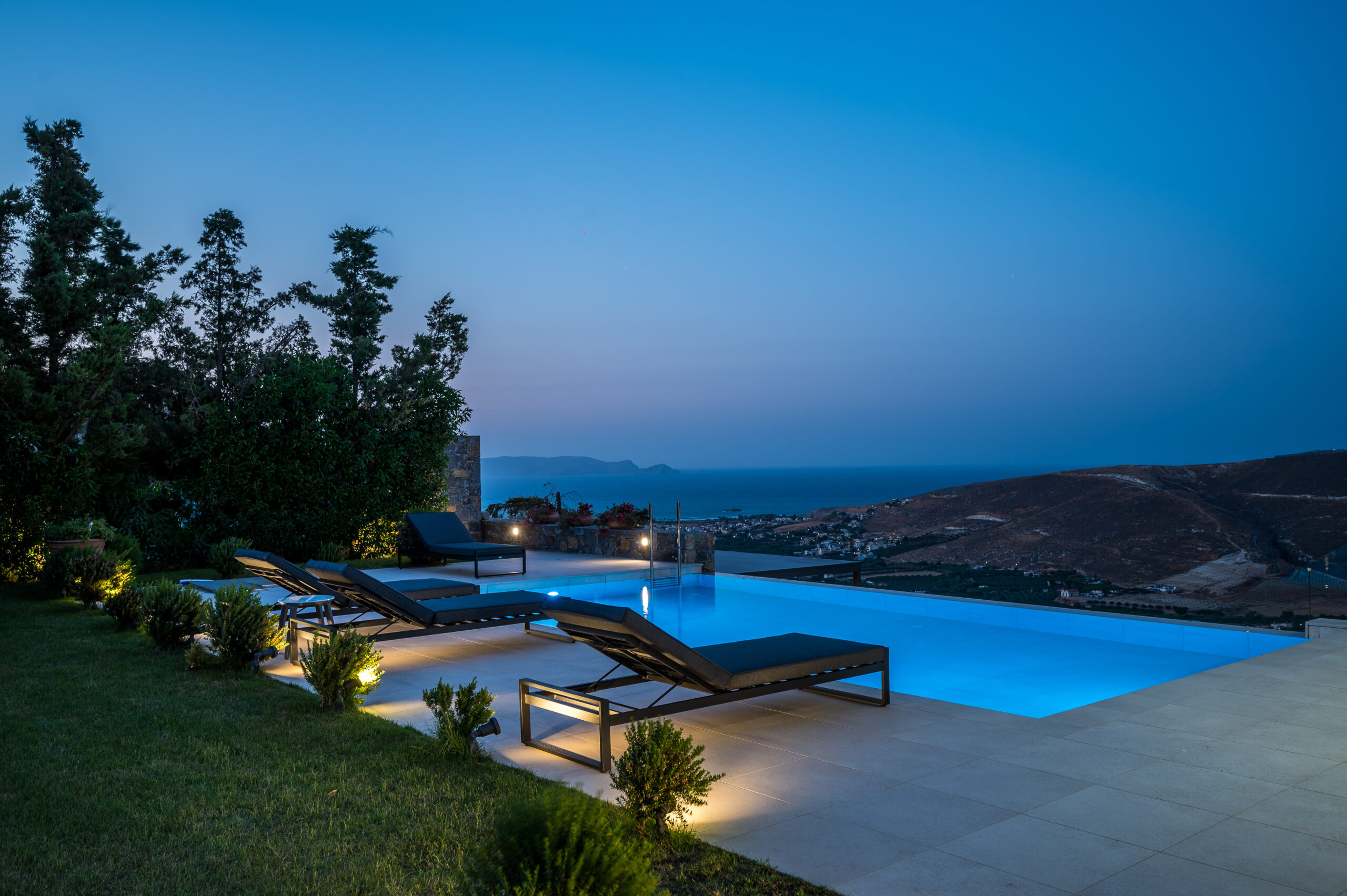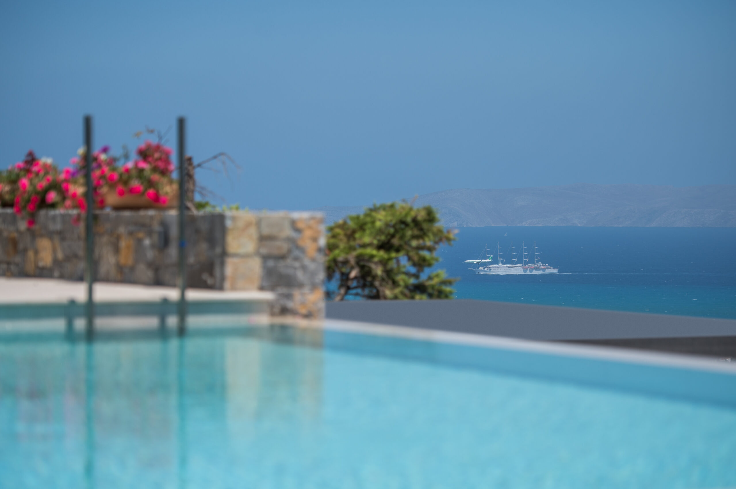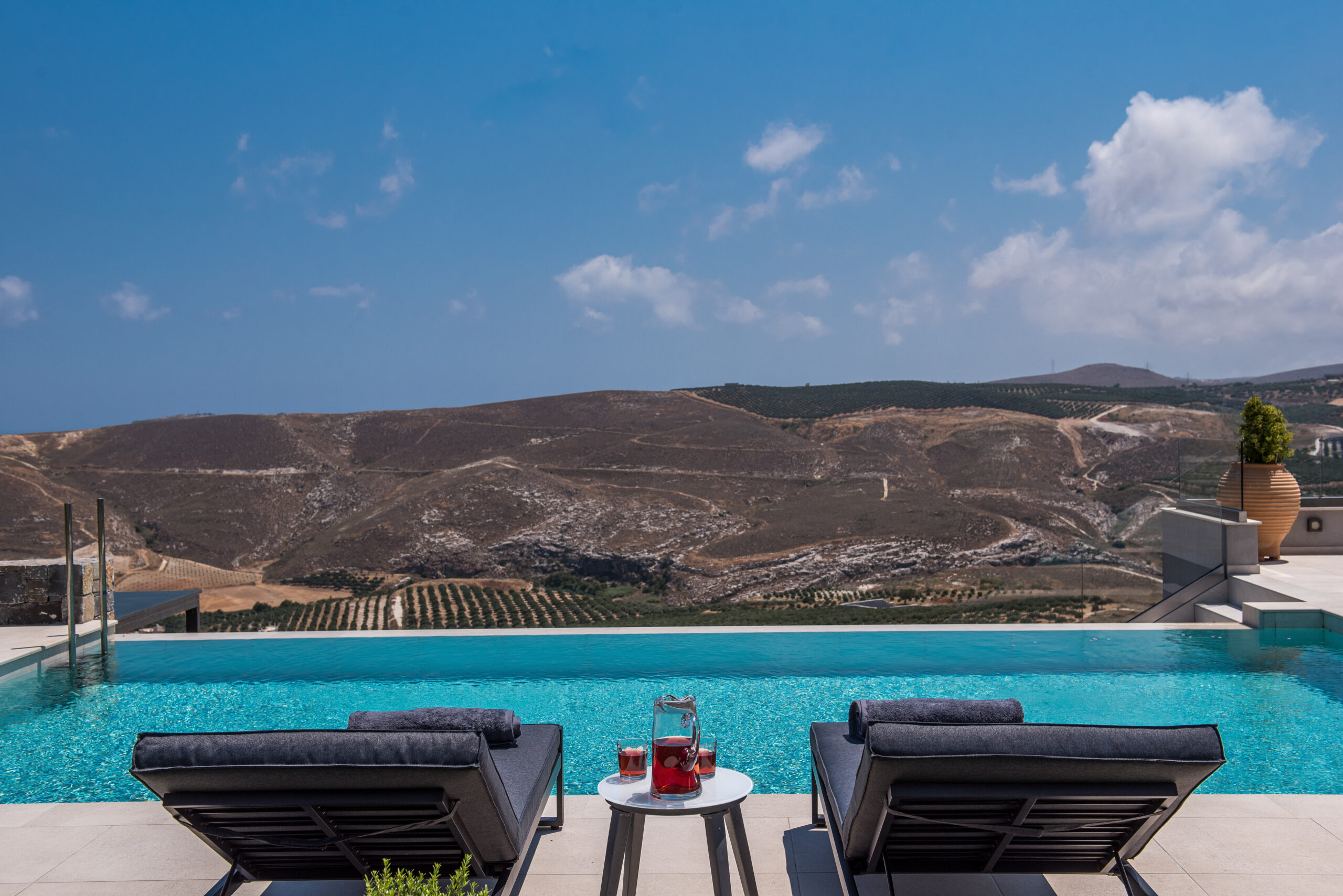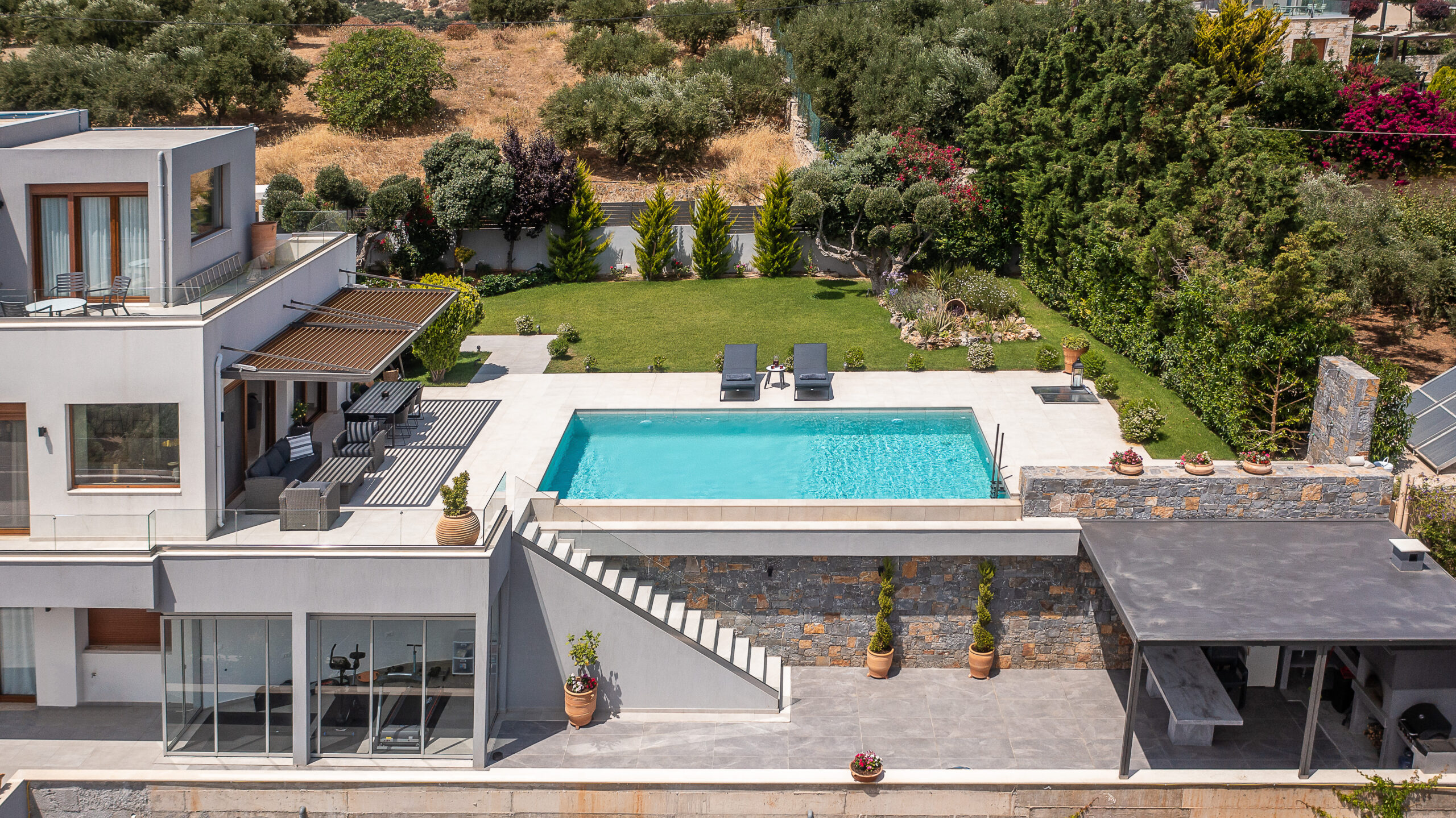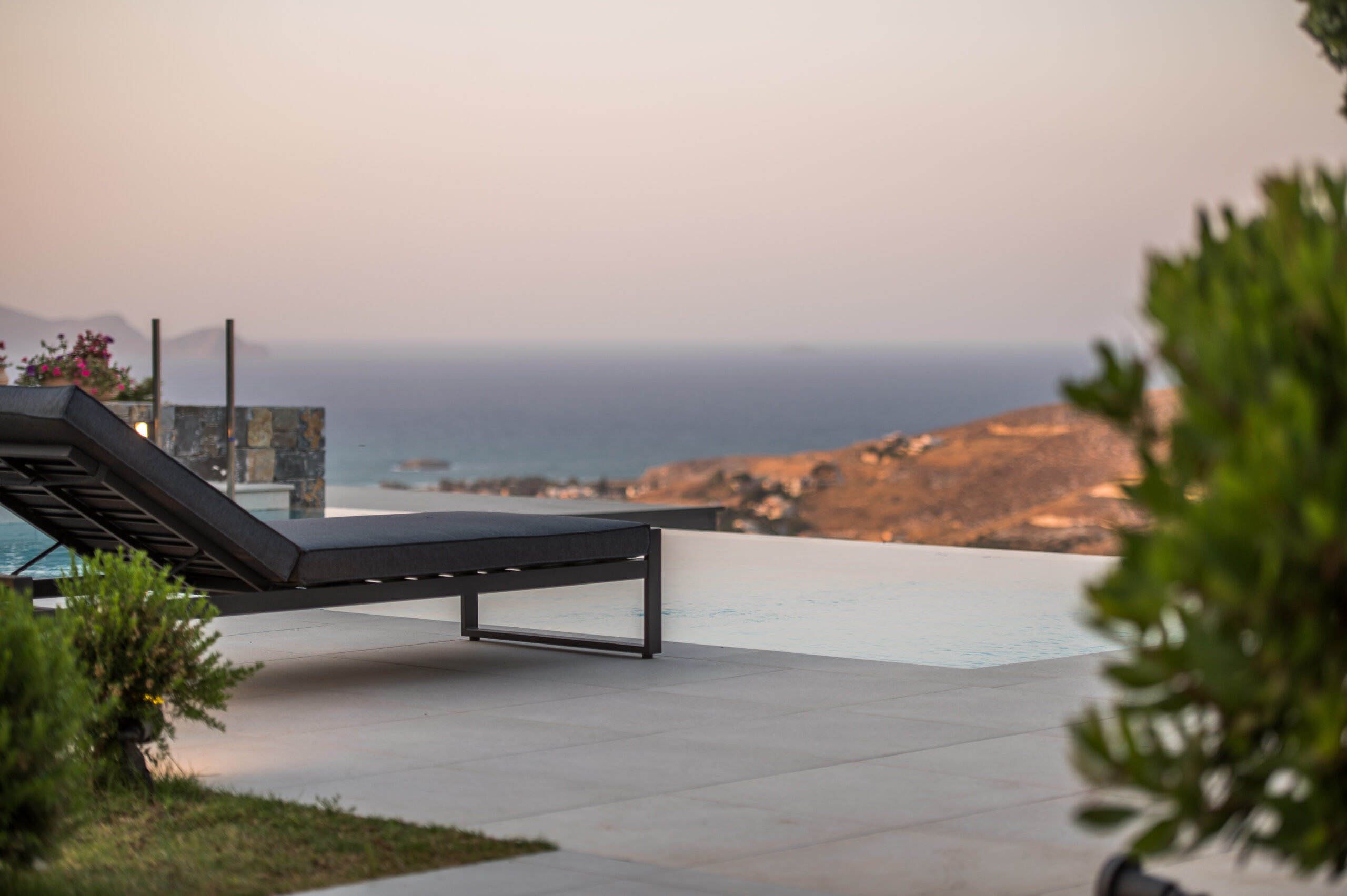 A private 50 m² (539 ft²) infinite edge swimming pool (depth 1,5m), overlooking the Cretan sea, completes the feeling of seclusion and luxury. The pool (lit at night) is provided with comfortable sunbeds and is surrounded by non slippery tile and lawned areas, perfectly kept and ideal for sunbathing, playing or relaxing.
