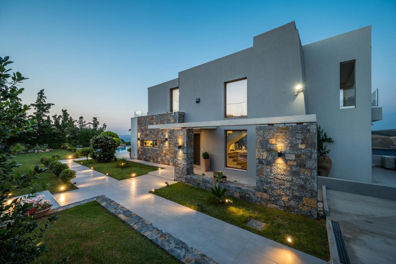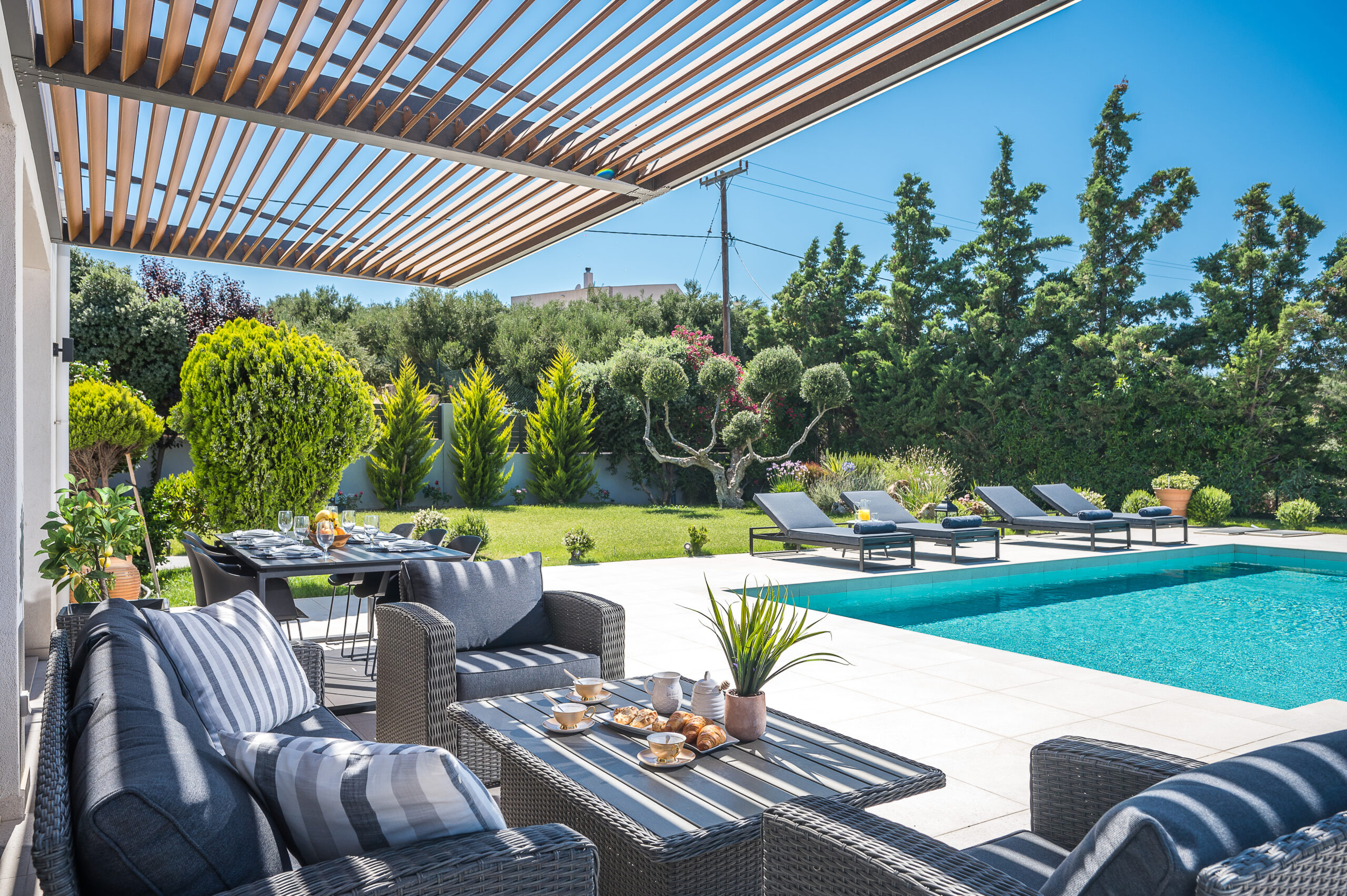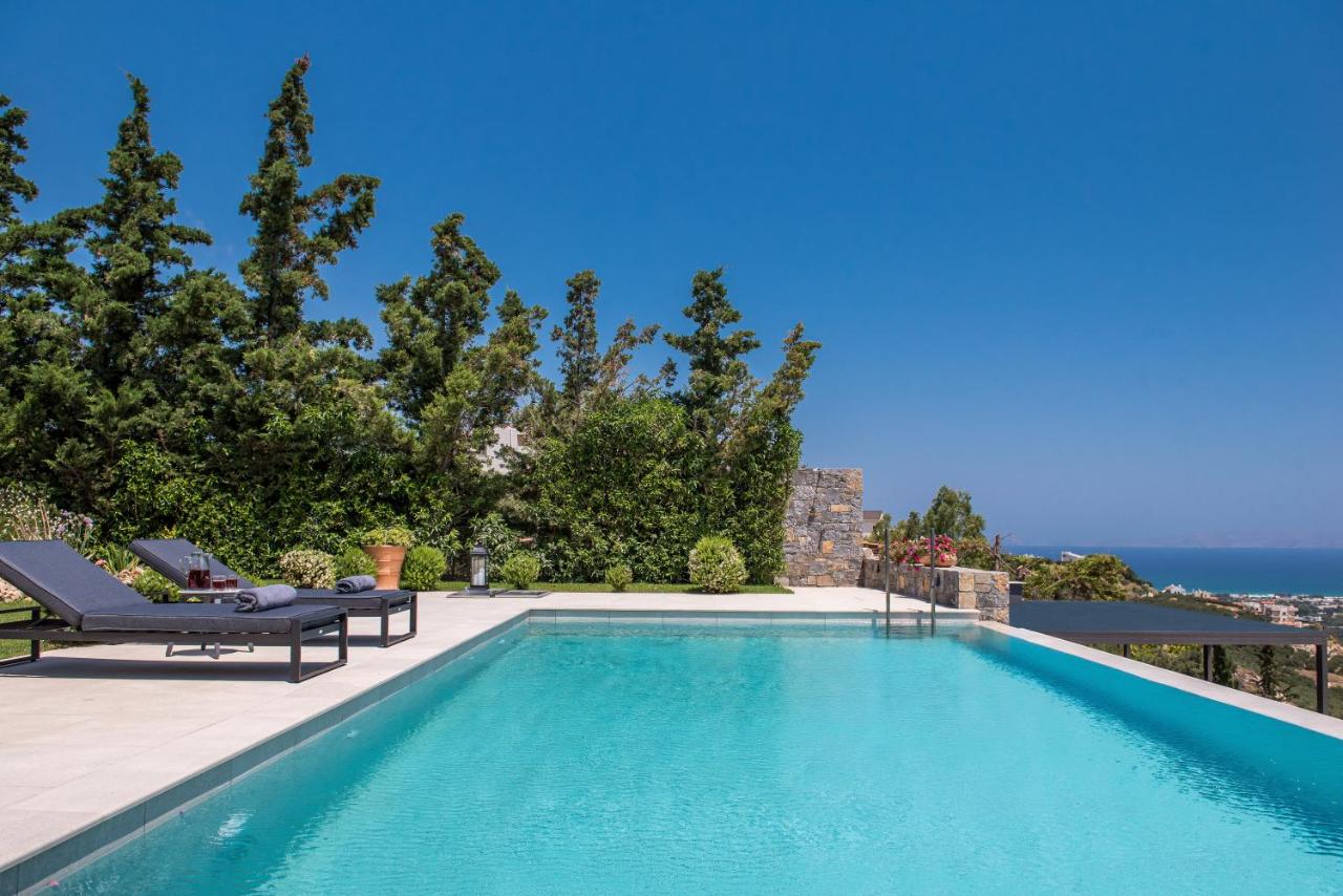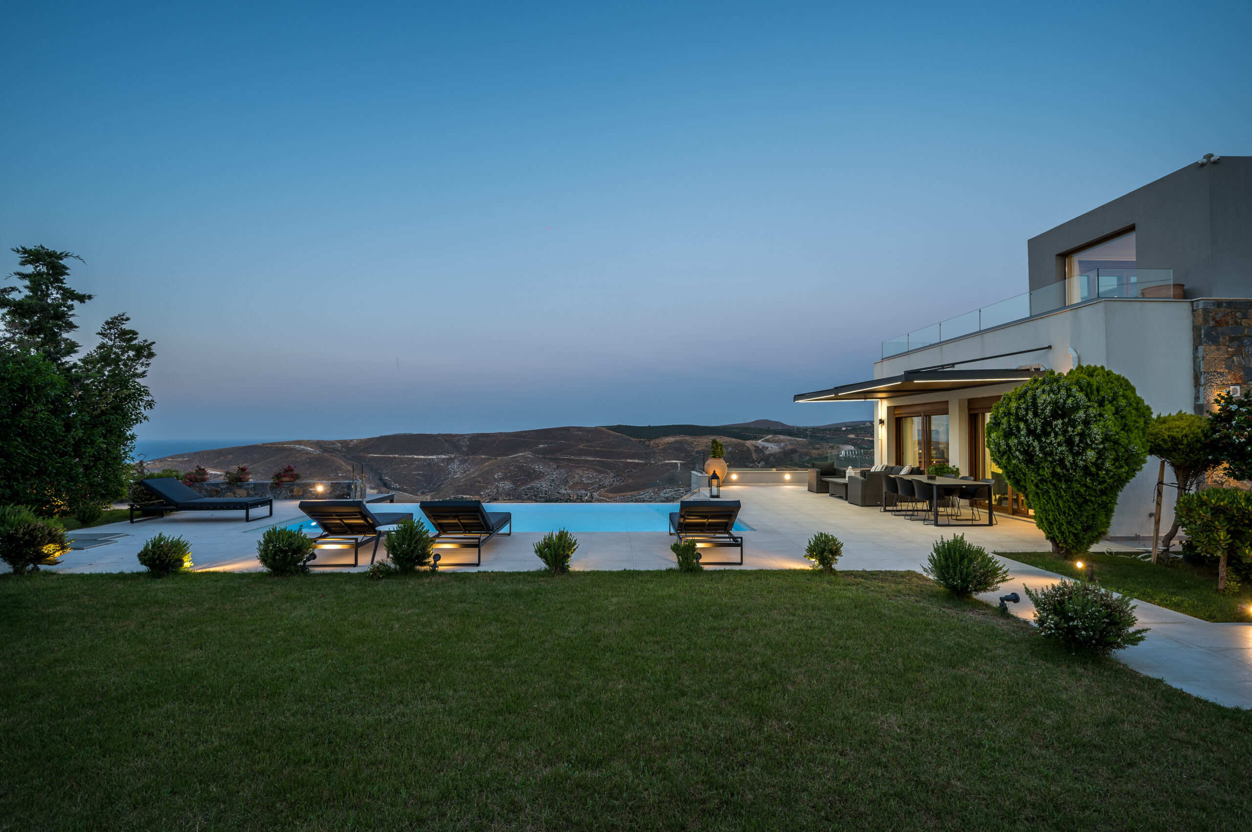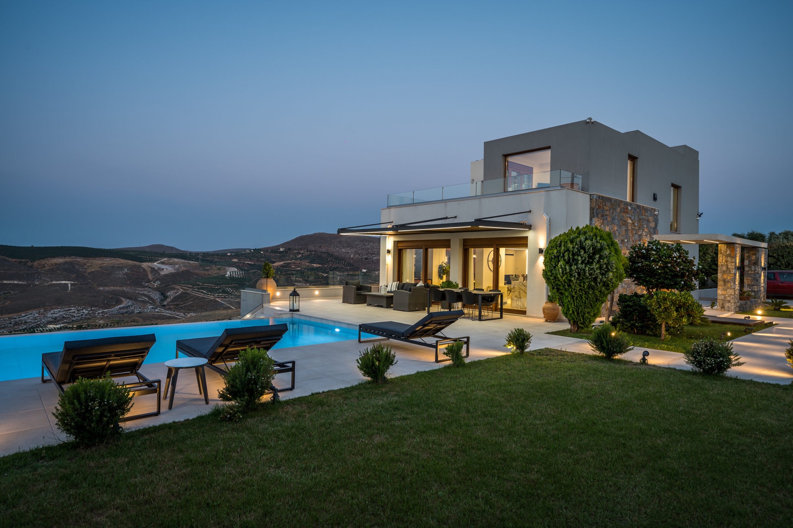 A private 50 m² (539 ft²) infinite edge swimming pool (depth 1,5m), overlooking the Cretan sea, completes the feeling of seclusion and luxury. The pool (lit at night) is provided with comfortable sunbeds and is surrounded by non slippery tile and lawned areas, perfectly kept and ideal for sunbathing, playing or relaxing.