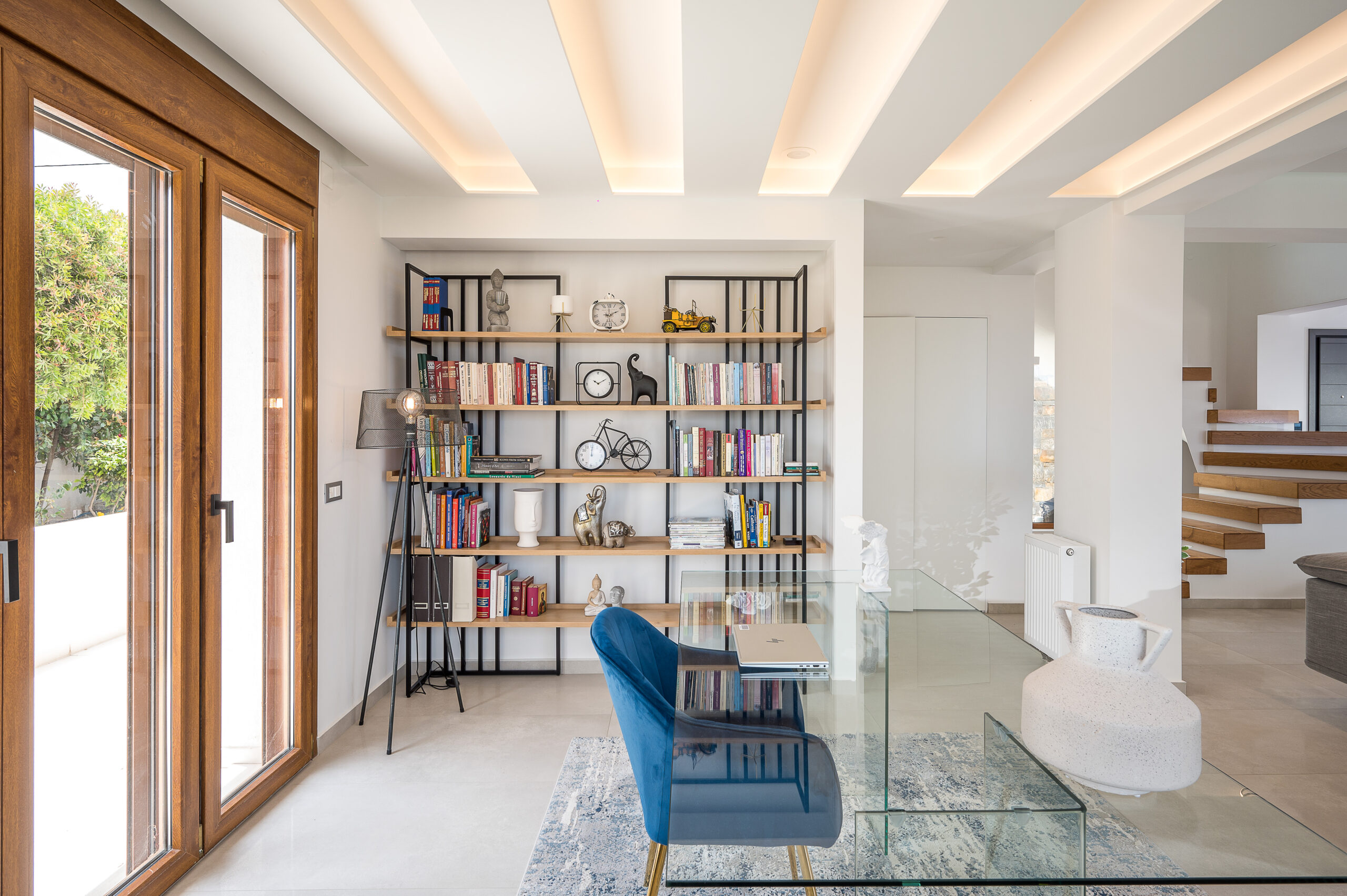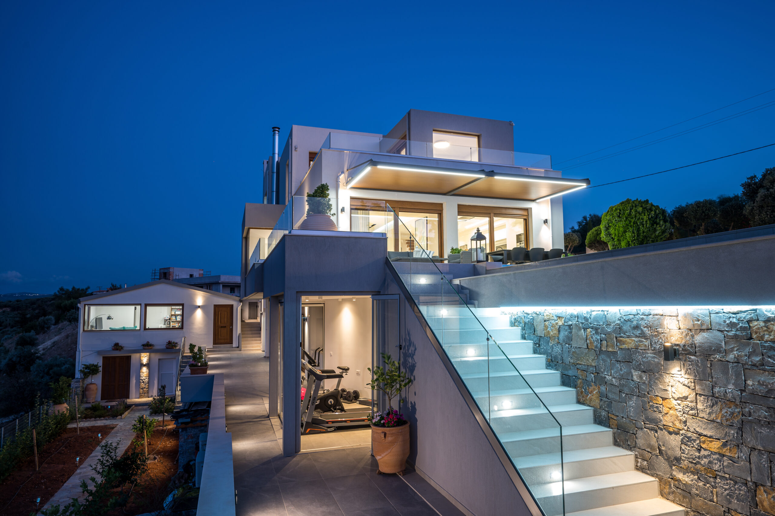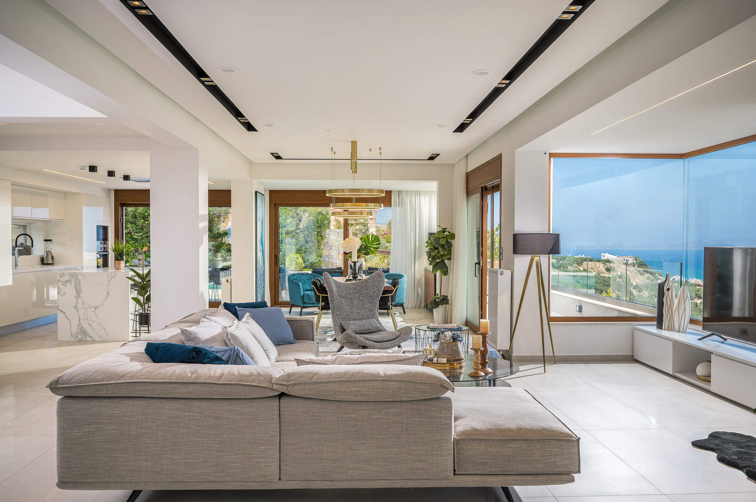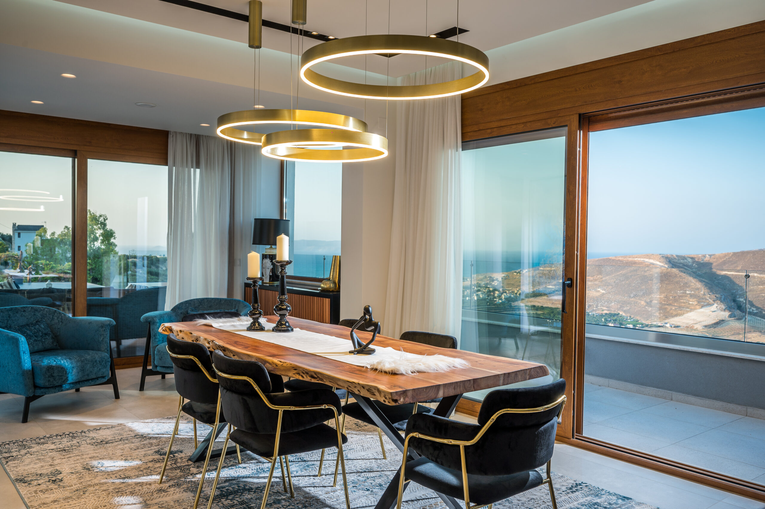 The main floor (middle floor) features a large sitting lounge with TV, a dining area with a hand-grafted table, an enormous fully equipped kitchen with a marble island centerpiece, a WC, and an elegant open office space, all overlooking the endless blue of the Cretan sea and the surrounding valley hills via vast windows and sliding doors. Middle floor openings lead to the pool, the gardens and all outdoor sitting areas.