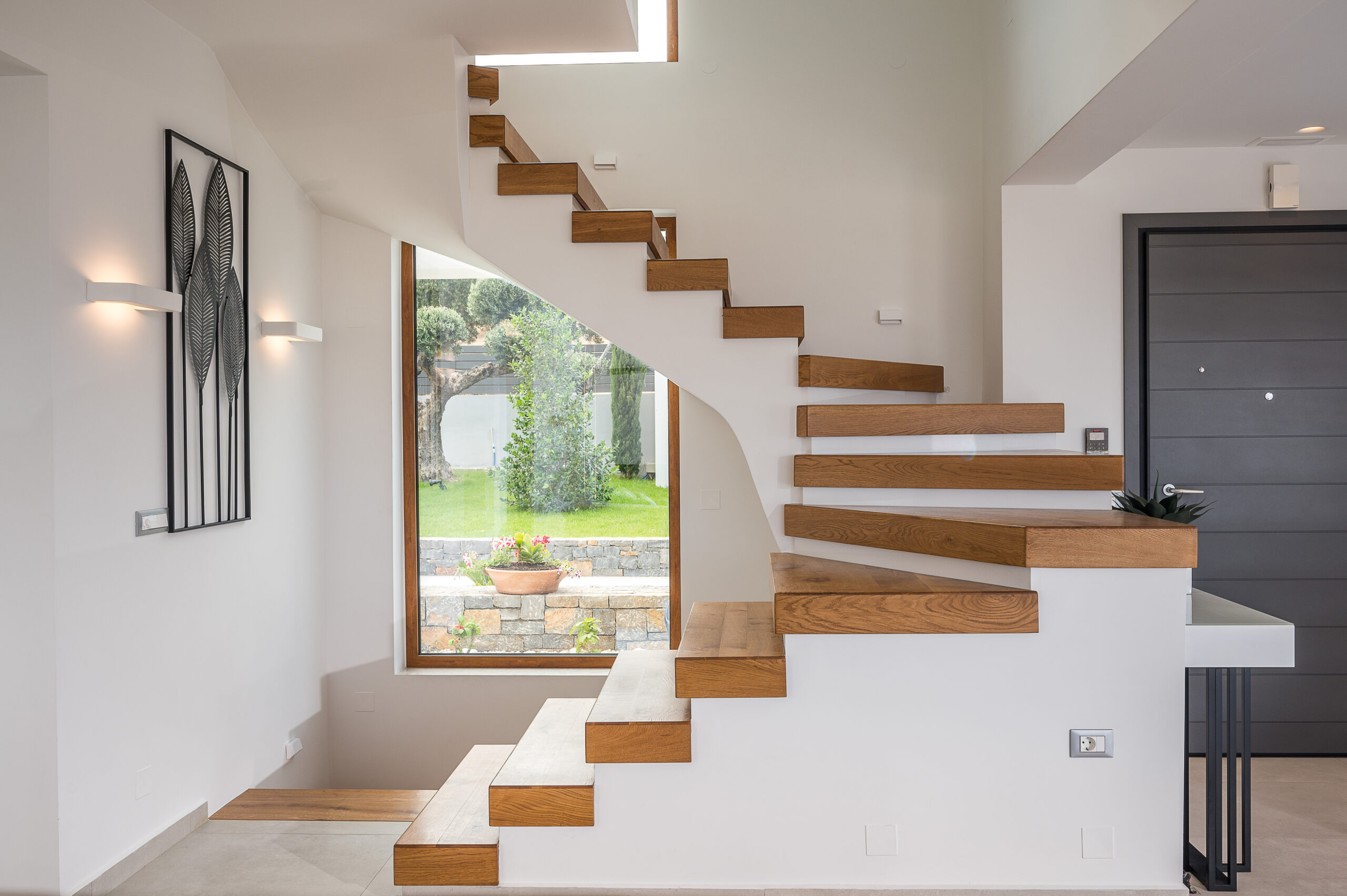 Stylish wood and marble stairs lead to upper and lower floors. The airy and bright upper floor includes 2 bedrooms and a family bathroom.