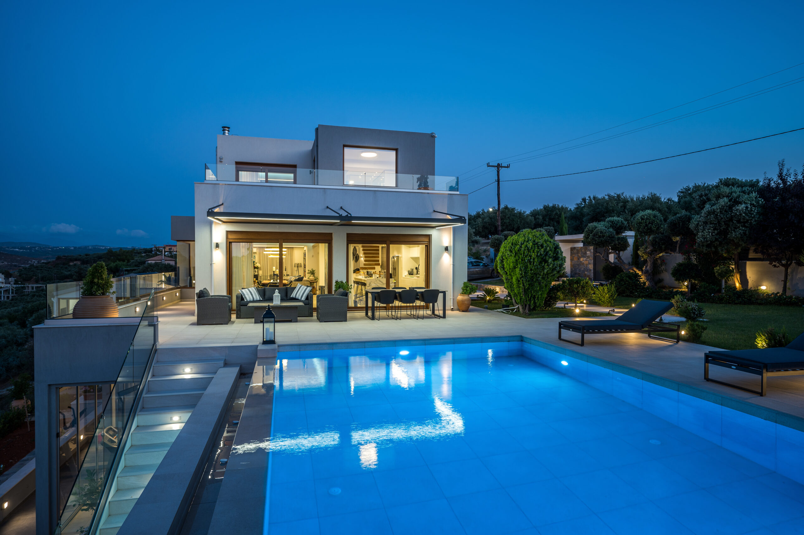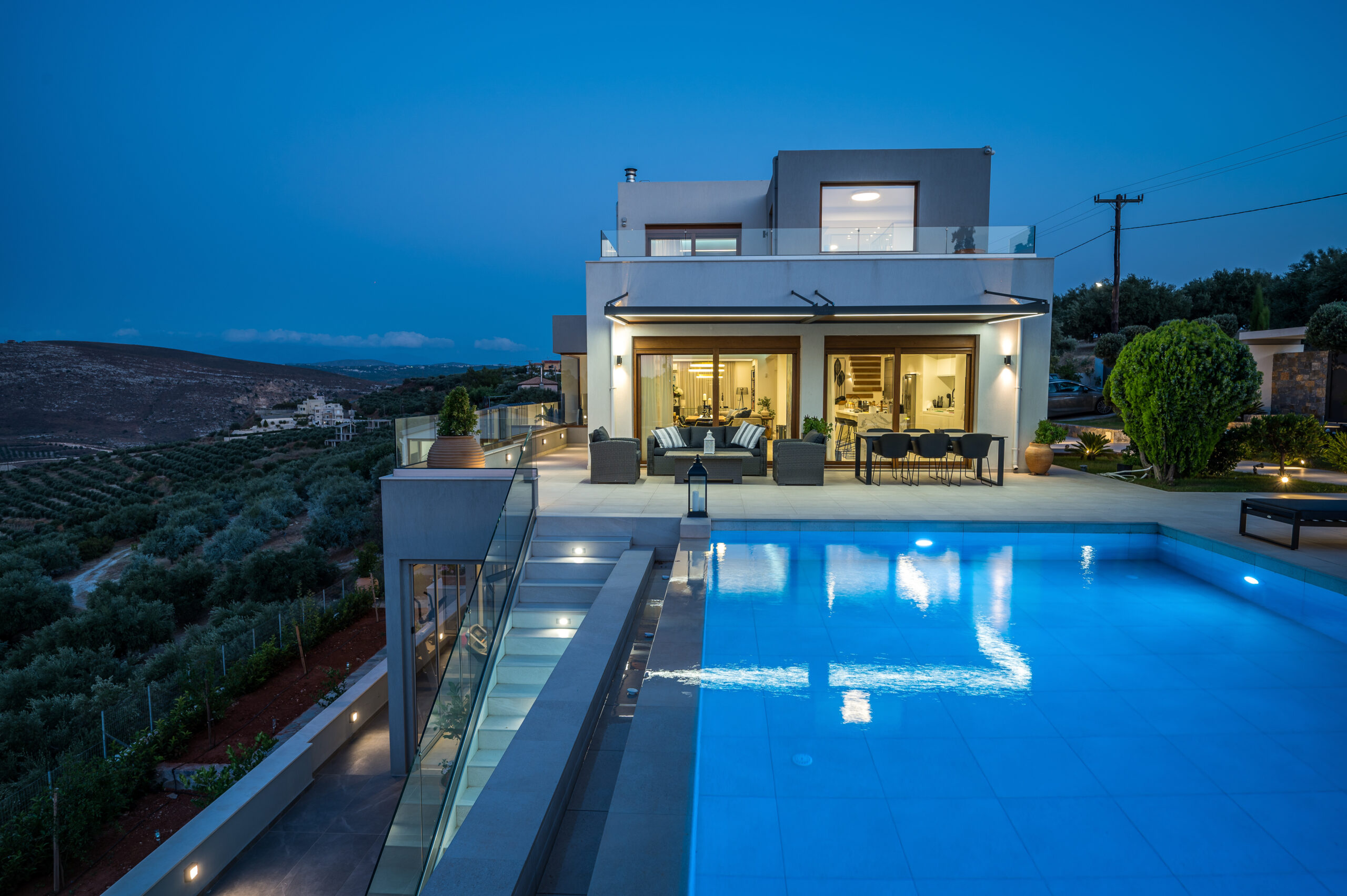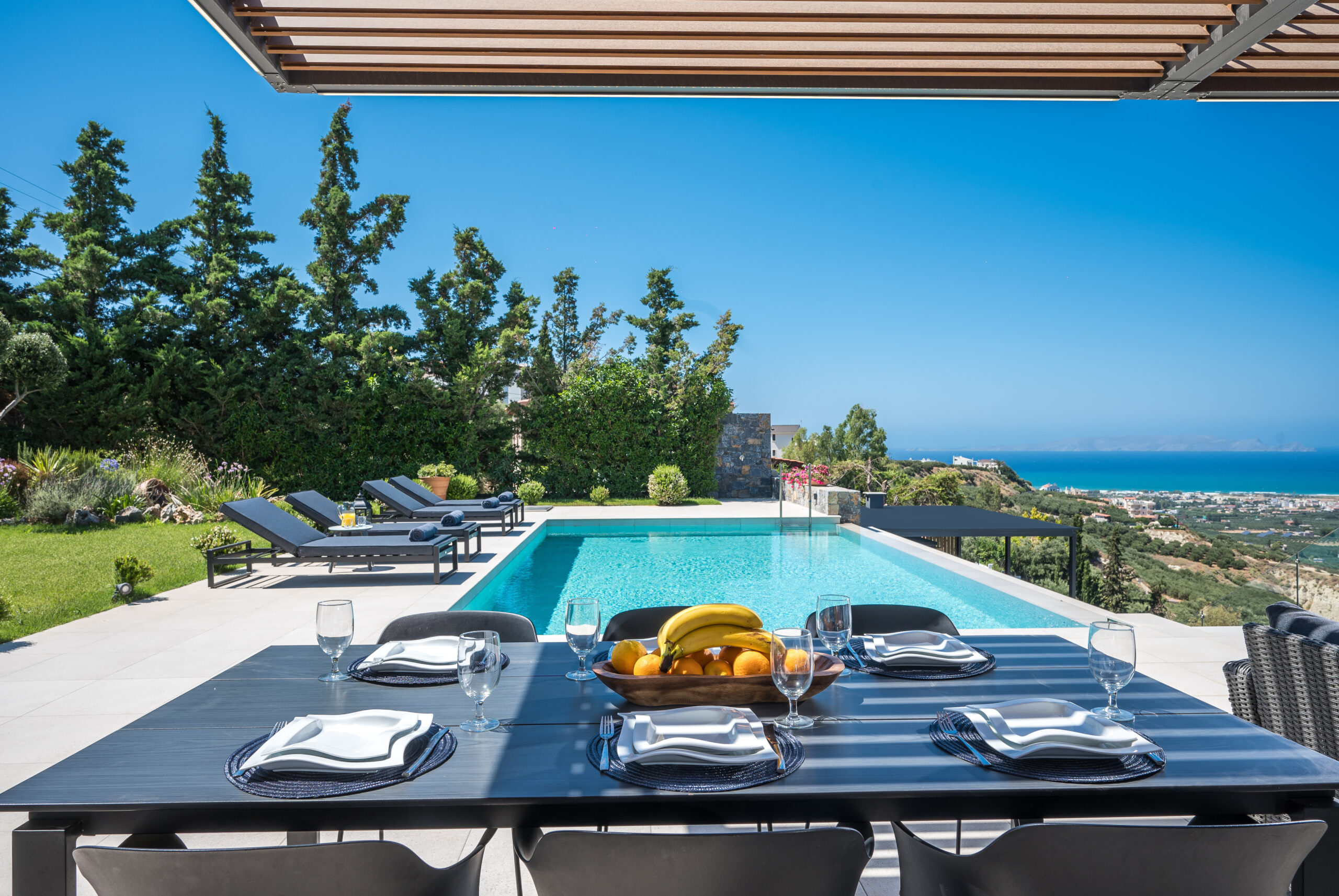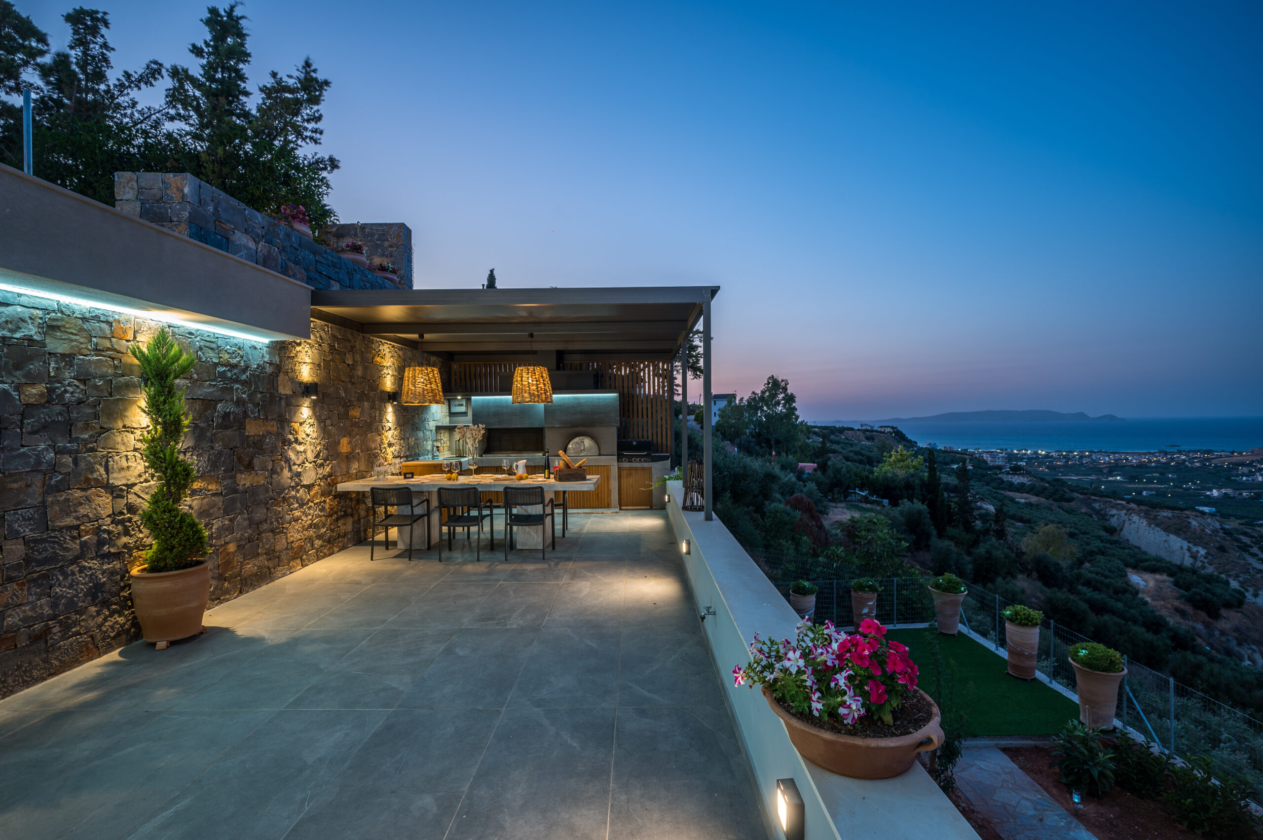 Eunoia Blue Villa in Heraklion, Crete provides a fabulous island retreat, complete with breathtaking 180⁰ mountain and sea views, ideal for large families, groups of friends or memorable destination wedding housing. Set on a prime hilltop location right in the middle of Crete’s island north coast, the villa combines the ideal contrast of the tranquility that one seeks in order to relax, reflect, study or practice, but still offering city life, historical sites, sandy beaches, romance and clubbing.