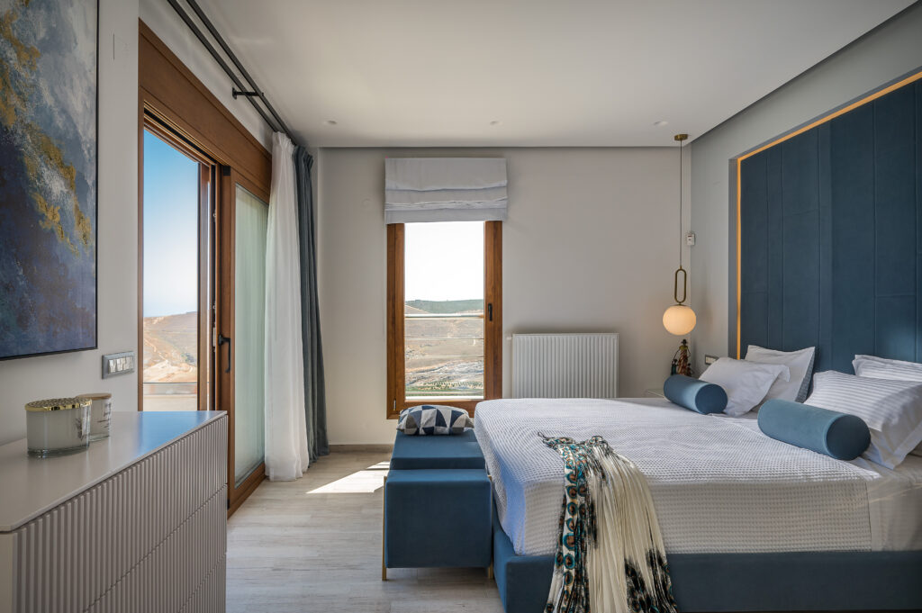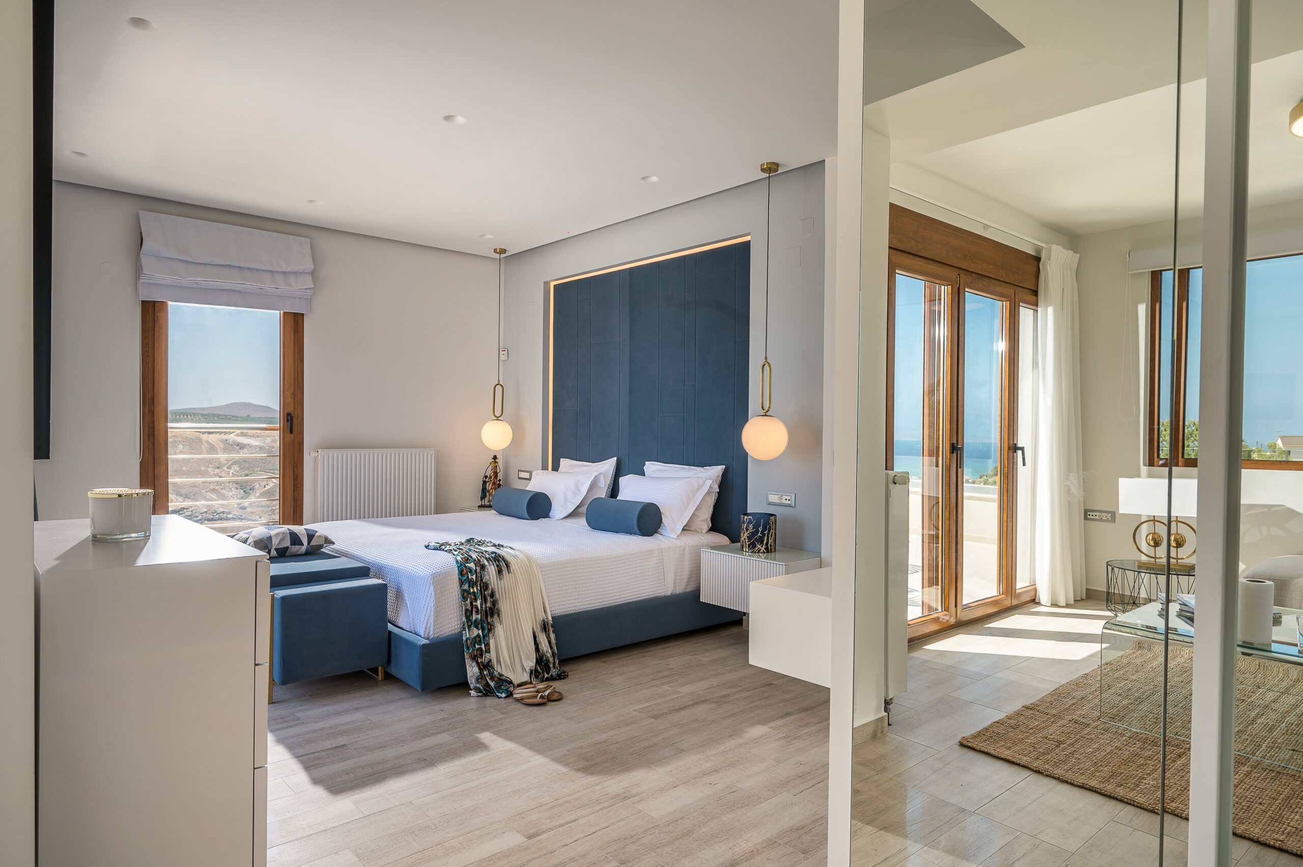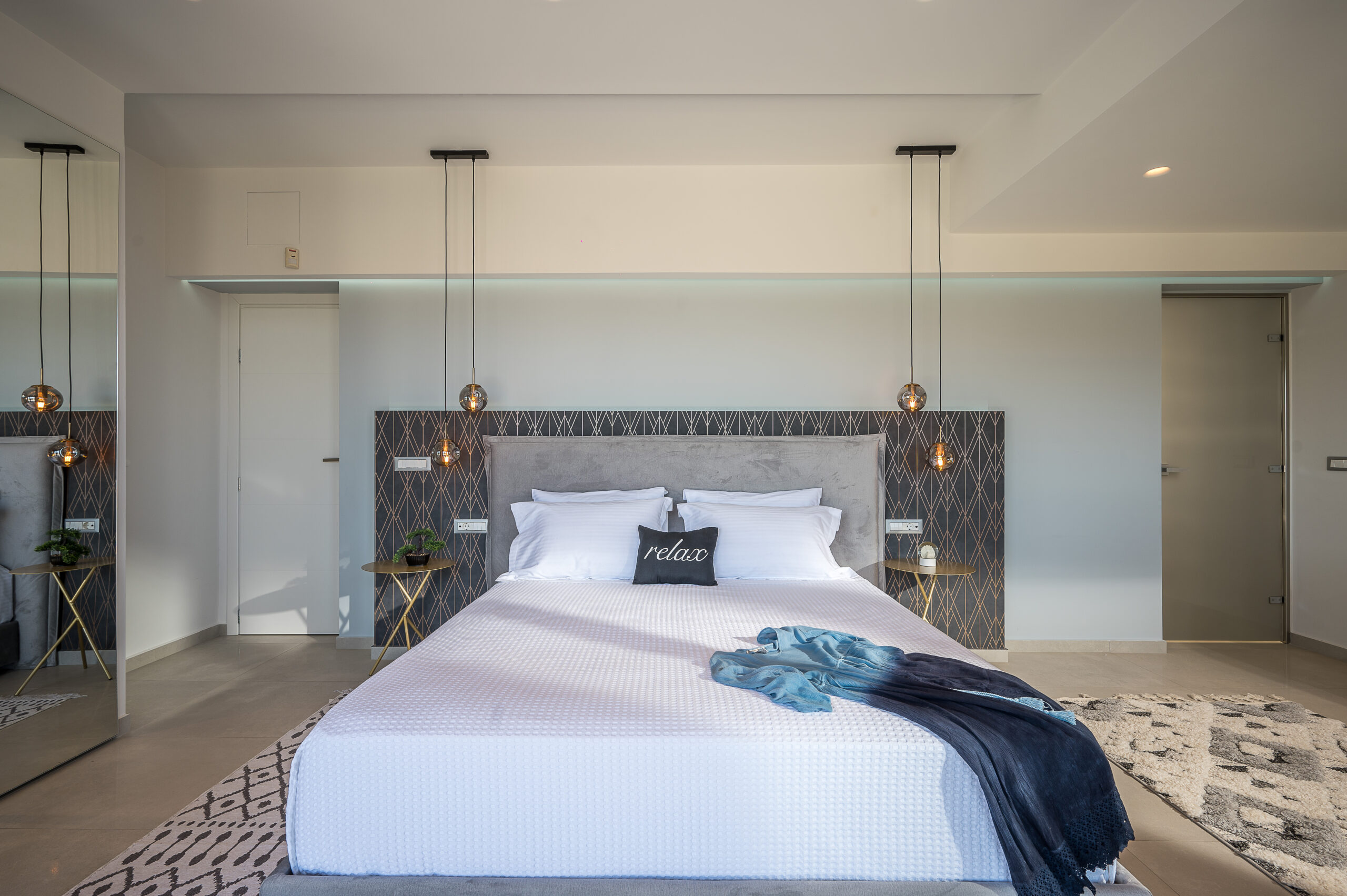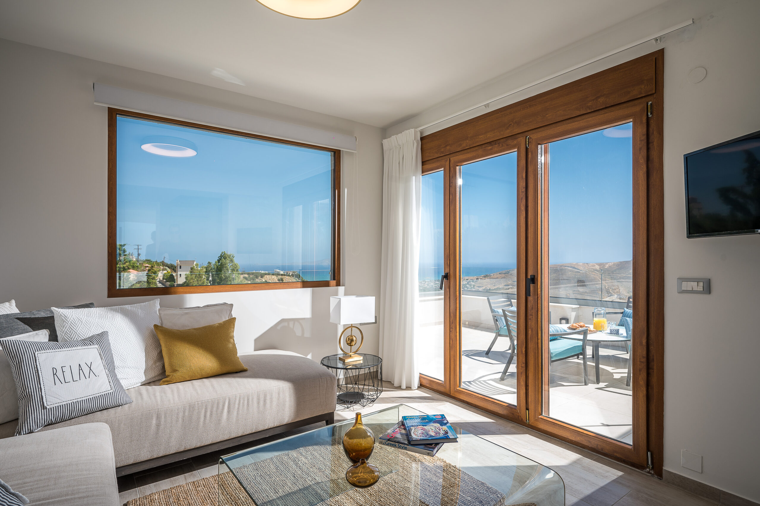 Both bedrooms feature upholstered California King size beds, extra sitting area and large doors that open to a common spacious patio overlooking the sea, the mountains and the beautiful garden with the citrus trees.