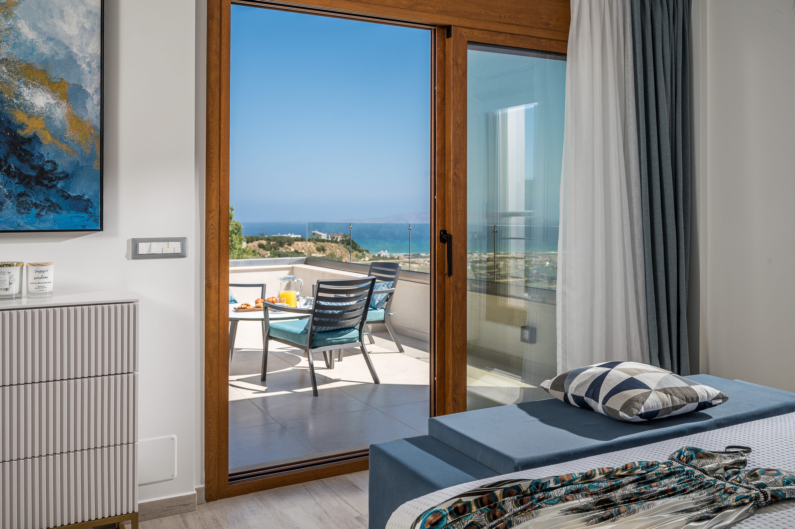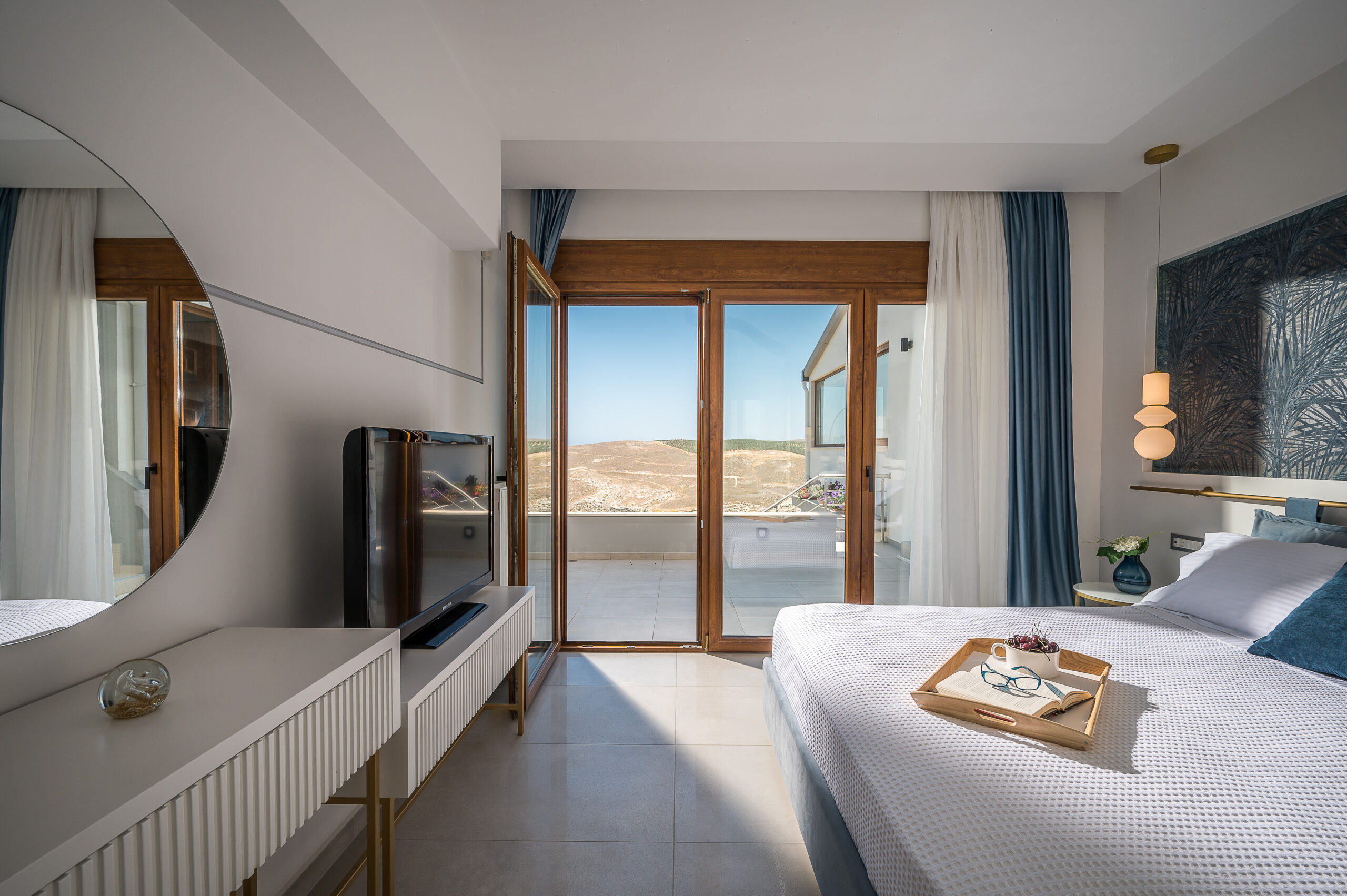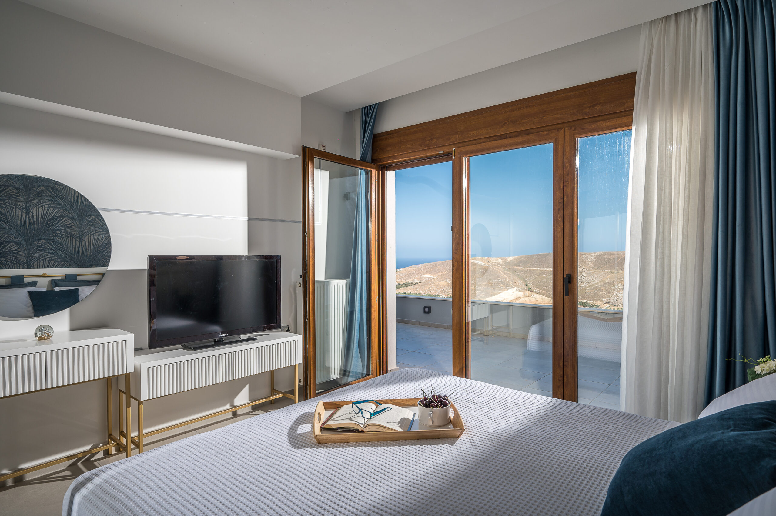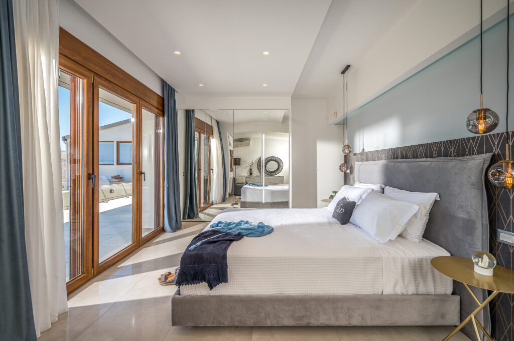 The spacious main bedroom features one upholstered king size bed and a large sitting area with a big couch and a mounted TV. Large sliding doors lead to a private and furnished patio with unobstructed breath-taking sea views.